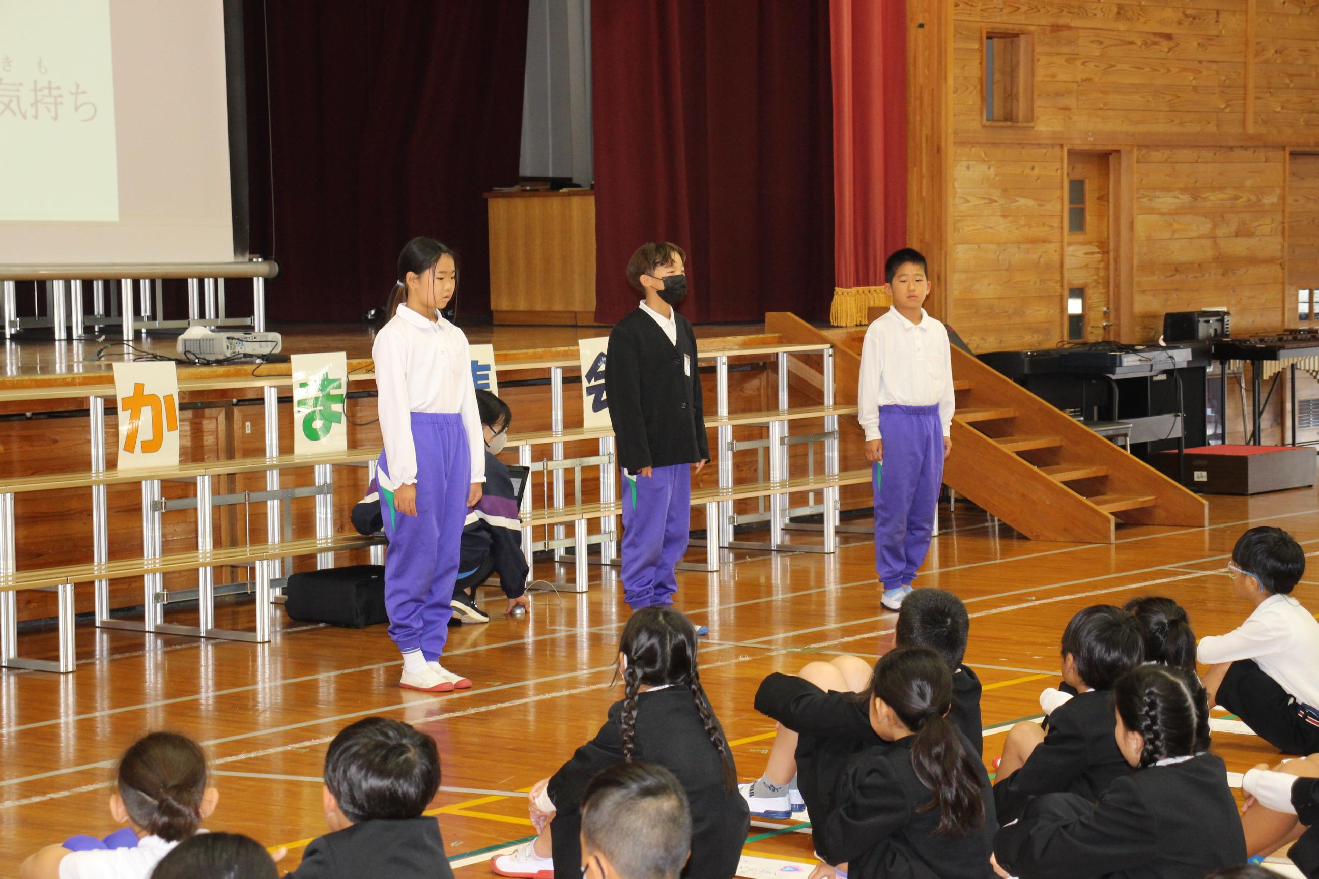 縦割り班に分かれて、自分たちが考えた人権標語を伝え合い、感想を言い合う活動では、友達の発表にしっかりと耳を傾けていました。