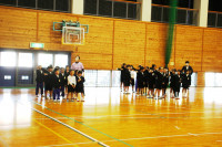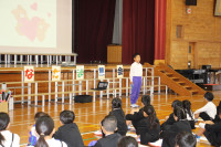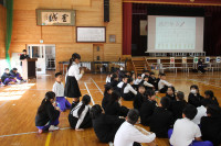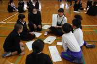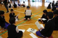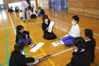 縦割り班に分かれて、自分たちが考えた人権標語を伝え合い、感想を言い合う活動では、友達の発表にしっかりと耳を傾けていました。
